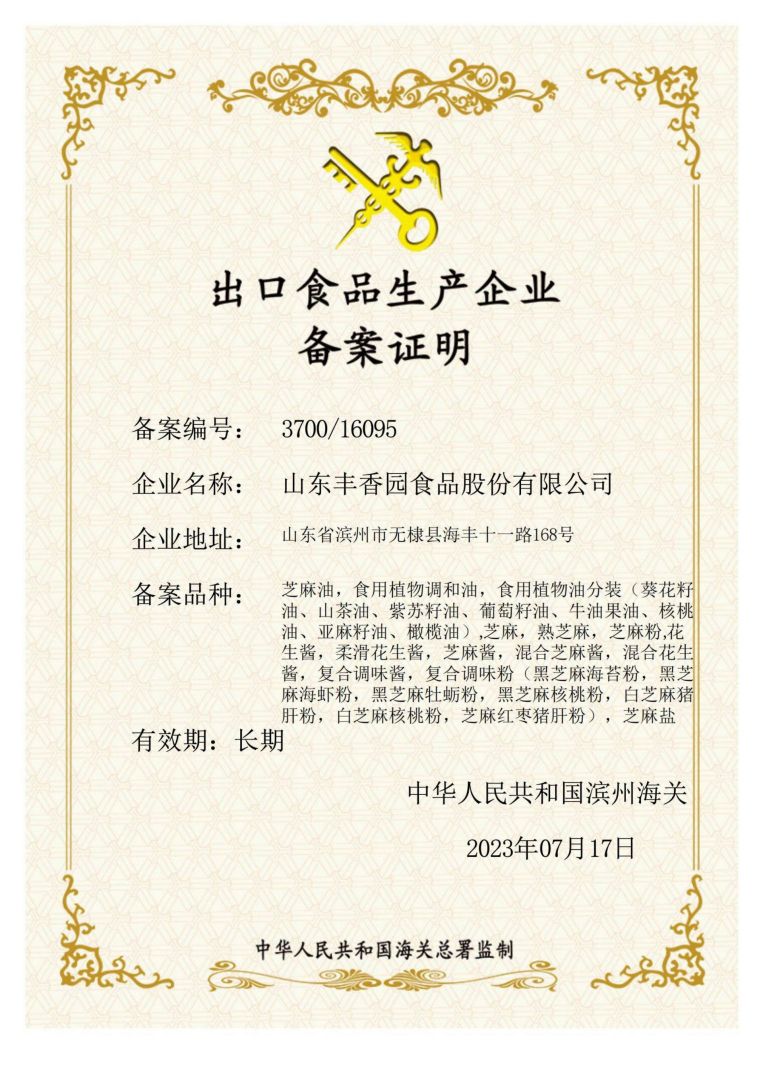 ? ? 豐香園小磨香油、芝麻調(diào)和油、花生醬、芝麻醬、混合醬、熟芝麻制品均已通過英國零售商協(xié)會BRC認證、歐盟 美國和國內(nèi)有機、HACCP體系認證,是山東省出口食品備案企業(yè)。